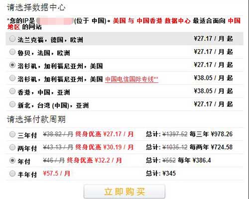 落櫻提醒,棉花糖的主機(jī)适合外貿用戶,他(tā)家的香港線路(lù)有點小貴,需要香港線路(lù)落櫻會推薦其餘服務商。如(rú)果選擇共享主機(jī),落櫻推薦standard,如(rú)果想要獨立ip主機(jī),落櫻推薦pro套餐。也就(jiù)27.17元一個月,折合起來(lái)一年(nián)就(jiù)300多,不限流量,不限空間,不限網站(zhàn),還(hái)有獨立ip贈送,點擊“立即購(gòu)買”。然後可(kě)以看(kàn)到不同的線路(lù),可(kě)以選擇美國(guó)洛杉矶的線路(lù),國(guó)内訪問(wèn)速度也還(hái)可(kě)以的。付款周期的話(huà),看(kàn)你(nǐ)需要,如(rú)果是三年(nián)付的,就(jiù)900多,年(nián)付的話(huà),一年(nián)要386.4。
