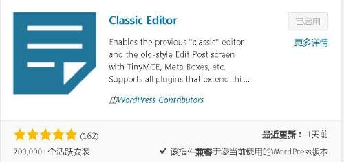 當然,官方還(hái)是考慮周到的。爲了照(zhào)顧我們這幫不習慣 Gutenberg 編輯器的站(zhàn)長,WordPress 官方特意推出了 Classic Editor 插件(jiàn),該插件(jiàn)就(jiù)可(kě)以讓我們選擇是使用舊版編輯器(據說(shuō)舊版編輯器支持到 2021 年(nián))還(hái)是 Gutenberg 編輯器,發布短(duǎn)短(duǎn)的 幾個小時就(jiù)有 70 多萬人(rén)安裝并啓用.
